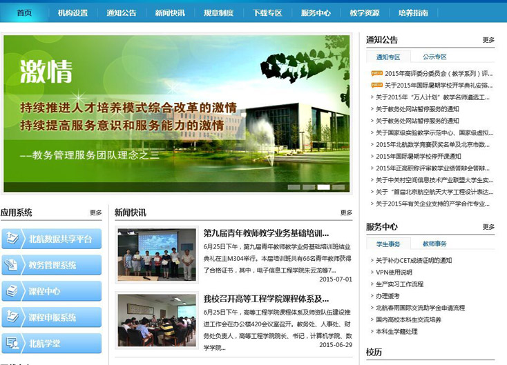 教务处网站是教务处信息对外公布及宣传的平台,同时也是教务相关各业务系统入口。面向全校师生,提供全面、权威、快速的办公平台和问题解决通道,是教务处的形象、喉舌、资讯平台和服务工具。引领大家体会到网络办公的快捷,引领目标用户找到需要的信息,为用户解决尽量多的问题。提升教务处的良好形象与美誉度。