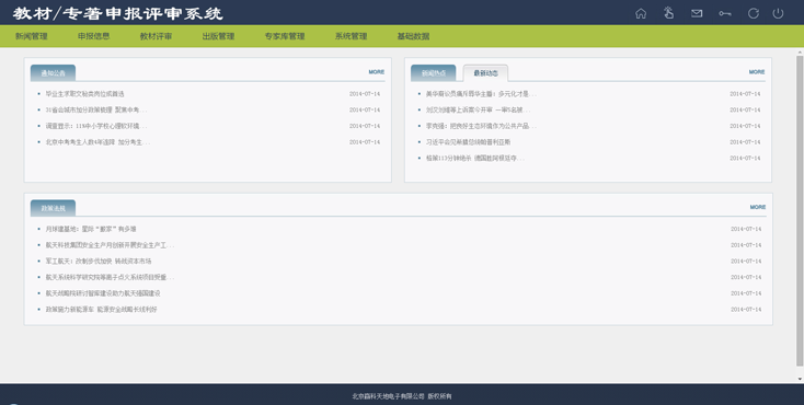 教材申报管理系统依据教学需求对教材进行申报及评审,以保证在教学中为学生提供高质量的教材,保证教材的科学性、适用性,促进符合要求的教材及时出版。系统功能包括教材申请、院系审核、专家评审、评审委员评审、评审结果确认、出版管理、新闻管理、教师管理、专家库管理、系统管理等。
