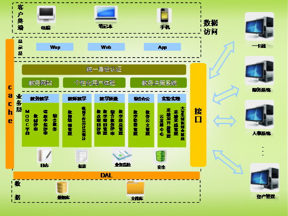 由于高等院校业务信息化建设初期,能够从底层设计整体规划解决方案的几乎没有,因此各高等院校的业务信息化系统一般呈现建设公司多,系统之间隔绝的特征。在当今大数据概念下,急需整合,形成整体的系统和统一的认证以及数据平台。基于以上原因,我公司为北航设计了如下信息系统架构,形成北航的教学一体化建设方案。