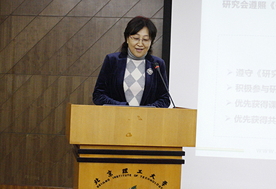 北京高校优质课程研究会副理事长、北京理工大学教务处栗苹处长则针对研究会共享课程建设情况作主要汇报,详细介绍了研究会的成立背景,机构设置与职能划分,共享平台建设、区域合作等工作内容,以及研究会在"十三五"期间"立足北京 辐射全国"的工作计划。现阶段研究会一期供课及审核工作已基本完成,包括来自北京大学、中国人民大学、对外经贸大学、北京交通大学、北京理工大学等重点院校的近20门优势课程,研究会将严格把控课程建设质量,确保高水平优质在线课程的共享,并推动在线课程的学分认定与教学互动。