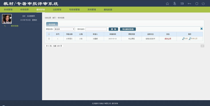 教材申报管理系统依据教学需求对教材进行申报及评审,以保证在教学中为学生提供高质量的教材,保证教材的科学性、适用性,促进符合要求的教材及时出版。系统功能包括教材申请、院系审核、专家评审、评审委员评审、评审结果确认、出版管理、新闻管理、教师管理、专家库管理、系统管理等。